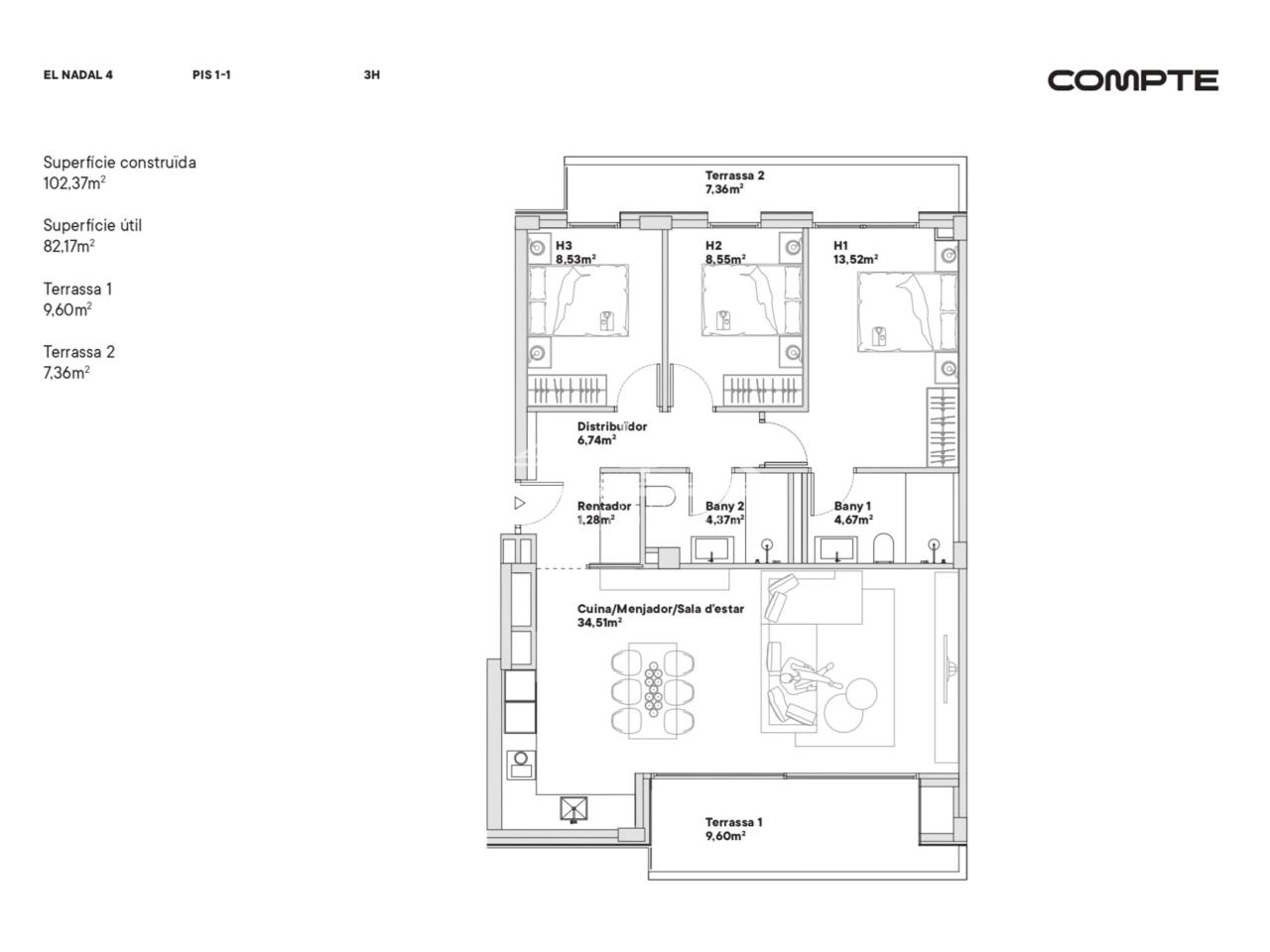 La zona de nit ofereix tres habitacions dobles, una d’elles en suite, que aporten comoditat i intimitat. Els dos banys complets, amb acabats actuals, reforcen la sensació de confort i qualitat.
